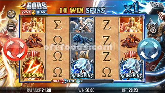 Hal pertama yang menonjol adalah dua tombol putar; satu merah, satu biru. Merah adalah warna Zeus, jadi biru untuk Thor. Dijuluki mekanik spin mesin slot Ganda, pada setiap spin mesin slot pemain bebas memilih salah satu tombol. Simbol Yunani Merah membayar dari kiri ke kanan, sedangkan simbol Norse Biru membayar dari kanan ke kiri. Memiliki sistem bayar dua arah secara efektif menggandakan garis pembayaran. Ini dipecah menjadi 1.024 cara menang untuk simbol merah dari gulungan paling kiri; 1.024 cara menang untuk simbol biru dari gulungan paling kanan.
